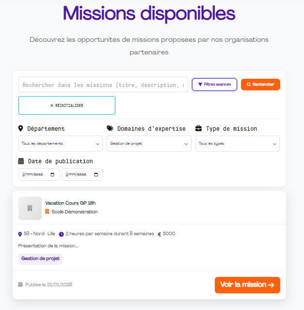 Puis filtrez par type (missions, formation, coaching), localisation, compétences exactes.