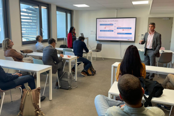 - Après un temps de networking convivial, les participants ont assisté à une présentation du PMI et de ses dispositifs d’accompagnement, Bruno Doucende, Armand Brice Fankam, Vincent Le Breut et Fouad Saighi