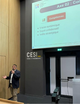 Dans cette dynamique, le PMI France était au rendez-vous, représenté par deux de ses membres bénévoles : Kamel ALABANE (consultant en transformation) et Stéphane MOUREU (Directeur de l’ingénierie SGI Groupe / FIMATEC). Leur mission ? Éclairer les futurs ingénieurs sur les compétences clés pour piloter la transformation digitale dans un monde VUCA, interconnecté et toujours plus exigeant.