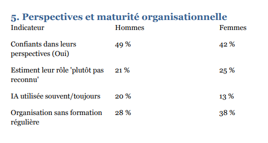 Les femmes se déclarent moins confiantes dans leurs perspectives d’évolution (42 % contre49 % des hommes). Elles évoluent aussi dans des organisations légèrement moins matures: moins de formation régulière, moins de processus formalisés et une adoption plus faible de l’IA.