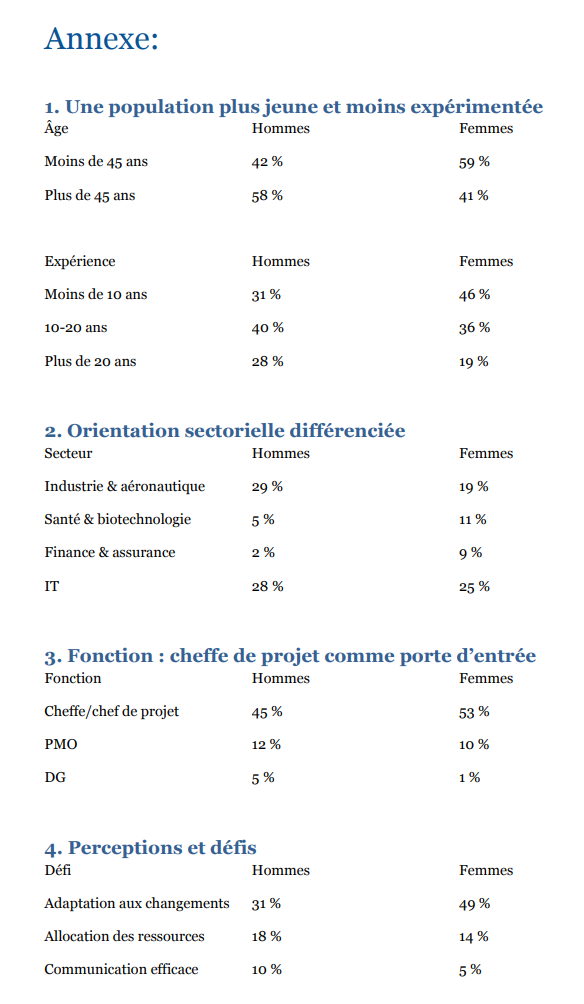 53 % des femmes se déclarent cheffes de projet (contre 45 % des hommes). Les postes de PMO, de gestion de portefeuille ou de programme sont paritaires, mais les postes de direction générale demeurent quasi exclusivement masculins.