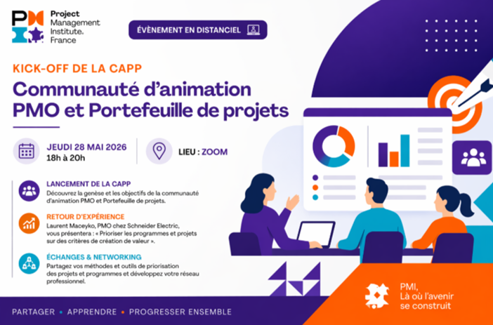 L'équipe du PMI France, est heureuse de vous convier à un évènement en distanciel le jeudi 28 mai 2026, de 18h à 20h, pour le lancement de la CaPP « Communauté d’animation PMO et Portefeuille de projets ».