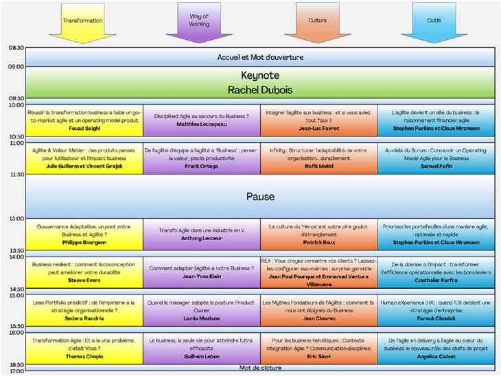 Conférences stratégiques sur l’intégration de l’agilité au cœur du business et sur les pratiques qui créent de la valeur.